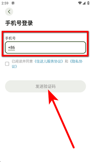4、在手机号登录页面,输入手机号,勾选同意后,点击发送验证码。
