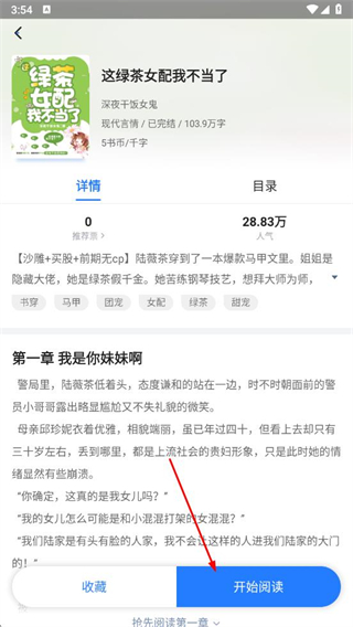 3、在小说详情页面,点击开始阅读按钮,即可开始看书。