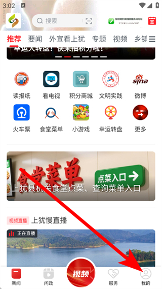 1、在上犹县融媒体客户端首页页面,点击底部我的选项,进入个人页面。
