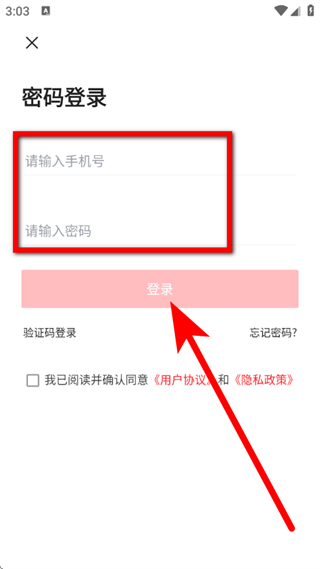 4、在密码登录页面,输入手机号和密码,勾选后,点击登录,完成账号登录。