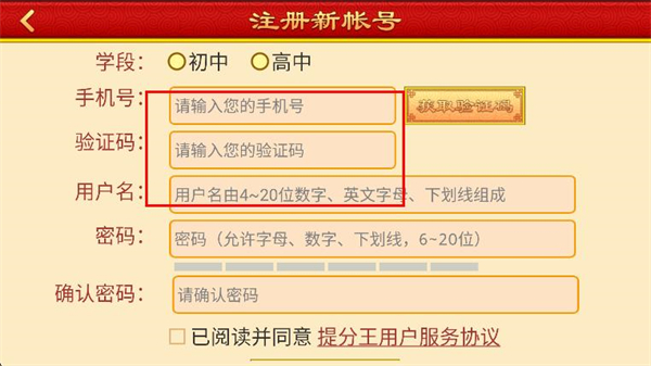 2、在注册页面选择学段,填写要手机号,和验证码。