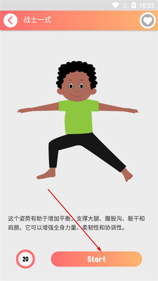 2、在具体动作页面,查看动作示范及说明后,点击Start开始该动作的计时练习。
