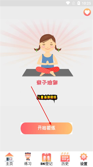 1、在亲子瑜伽app的练习页面,选择对应的瑜伽项目,点击开始锻炼进入动作页面。