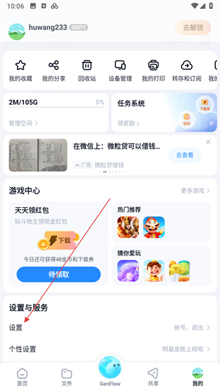 2、在个人中心界面的设置与服务板块里,找到设置选项并点击,进入设置。