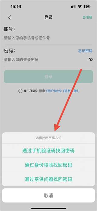 3、在账号密码登录界面,点击忘记密码选项,触发找回密码的方式选择弹窗。