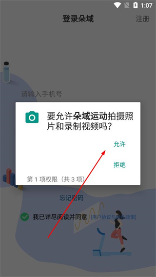 1、在朵域运动的登录页面,允许处理权限请求。