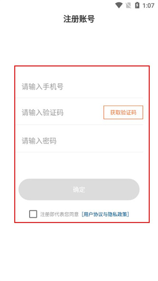 3、填写手机号、获取并输入验证码、设置密码勾选用户协议与隐私政策后,点击确定。