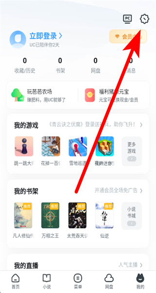 1、进入UC浏览器我的页面,点击右上角齿轮状设置图标,进入设置的界面。