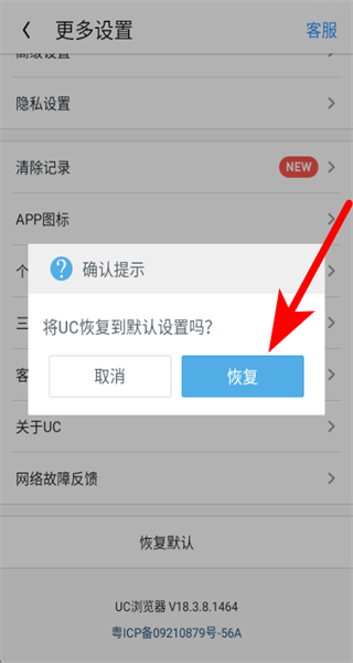 4、在弹出的确认提示框中,点击恢复按钮,即可恢复默认设置。