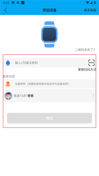 4、在添加设备页面中,填写注册码、设备昵称等信息,确认内容后点击确定按钮。